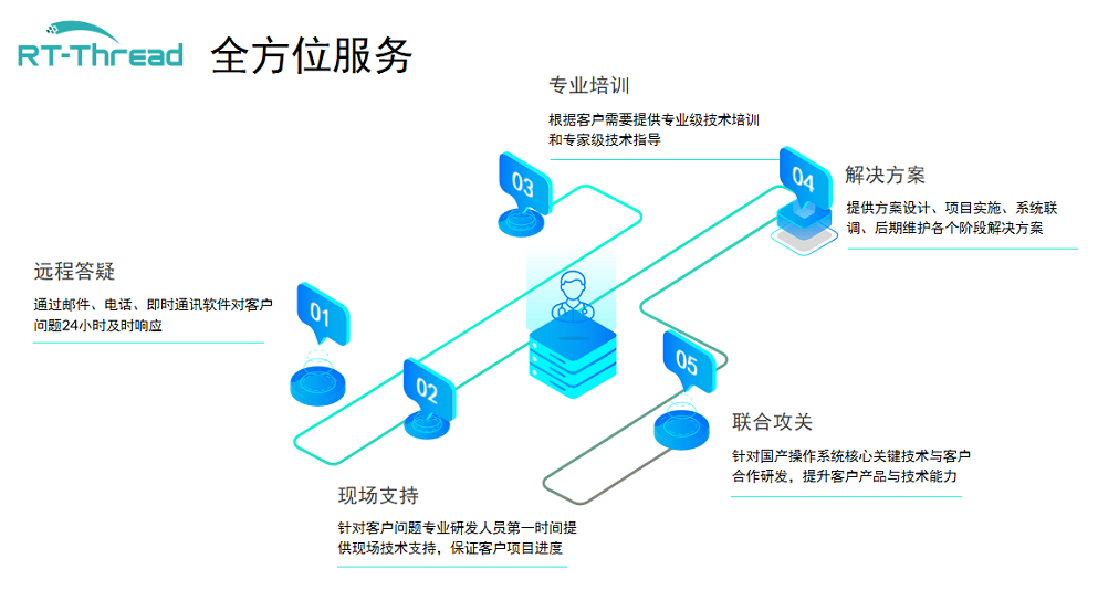 RT-Thread 产品会同时提供相应的技术支持及售后服务,并根据客户产品及项目实际情况,在双方充分沟通的基础上,在商务合同内明确相应的基础服务包,包括服务内容、服务期限、服务方式等。服务方式包括但不限于远程答疑(电话、邮件),线上支持(及时通信、系统上提case)、现场支持等。