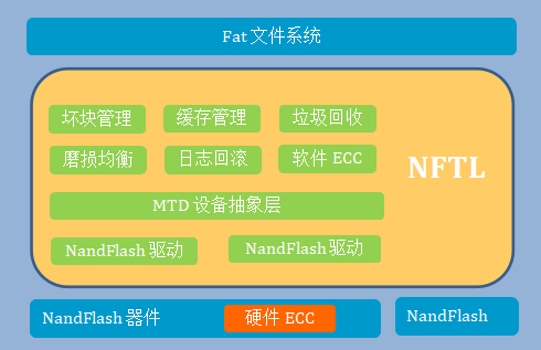 NandFlash 芯片的特性决定了不能采用磁盘驱动器的管理模式进行使用,需要利用闪存转换层 (NFTL)来模拟传统块设备的行为,NFTL 的功能介绍如下所示。