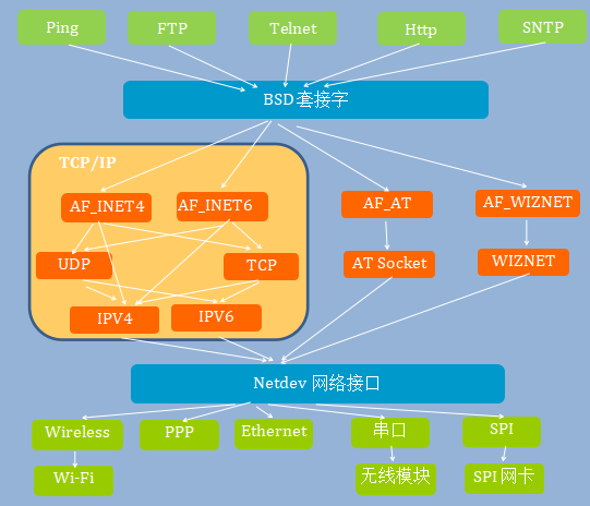 采用了全功能的 lwIP TCP/IP 协议栈,提供 BSD socket 标准风格的编程接口,支持: