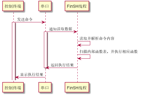 用户在控制终端输入命令,控制终端通过串口、USB、网络等方式将命令传给设备里的 FinSH,FinSH 会读取设备输入命令,解析并自动扫描内部函数表,寻找对应函数名,执行函数后输出回应,回应通过原路返回,将结果显示在控制终端上。当使用串口连接设备与控制终端时,FinSH 命令的执行流程,如下图所示: