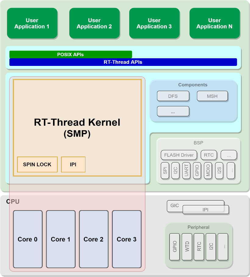 SMP 在一个计算机上汇集了一组处理器(多 CPU),各 CPU 之间共享内存子系统以及总线结构。它是相对非对称多处理技术而言的、应用十分广泛的并行技术,RT-Thread 可同时支持单核和 SMP 多核技术。