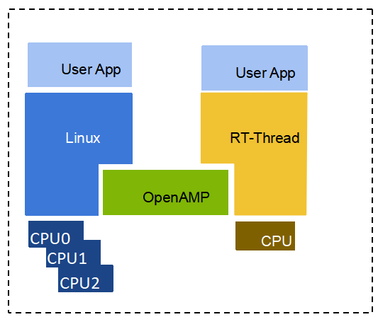 RT-Thread 支持 AMP 模式,能够在多核处理器上同时运行多个操作系统实例,例如 RT-Thread 和 Linux, 或是 RT-Thread 和 RT-Thread,系统之间通过软件总线进行通信,由 Linux 保证富应用,RT-Thread 保证强实时。一方面,能满足诸如实时数据采集、实时控制等苛刻场景下的应用,另一方面,使得原有非实时操作系统产品在升级时可以不用大幅重构原有代码。